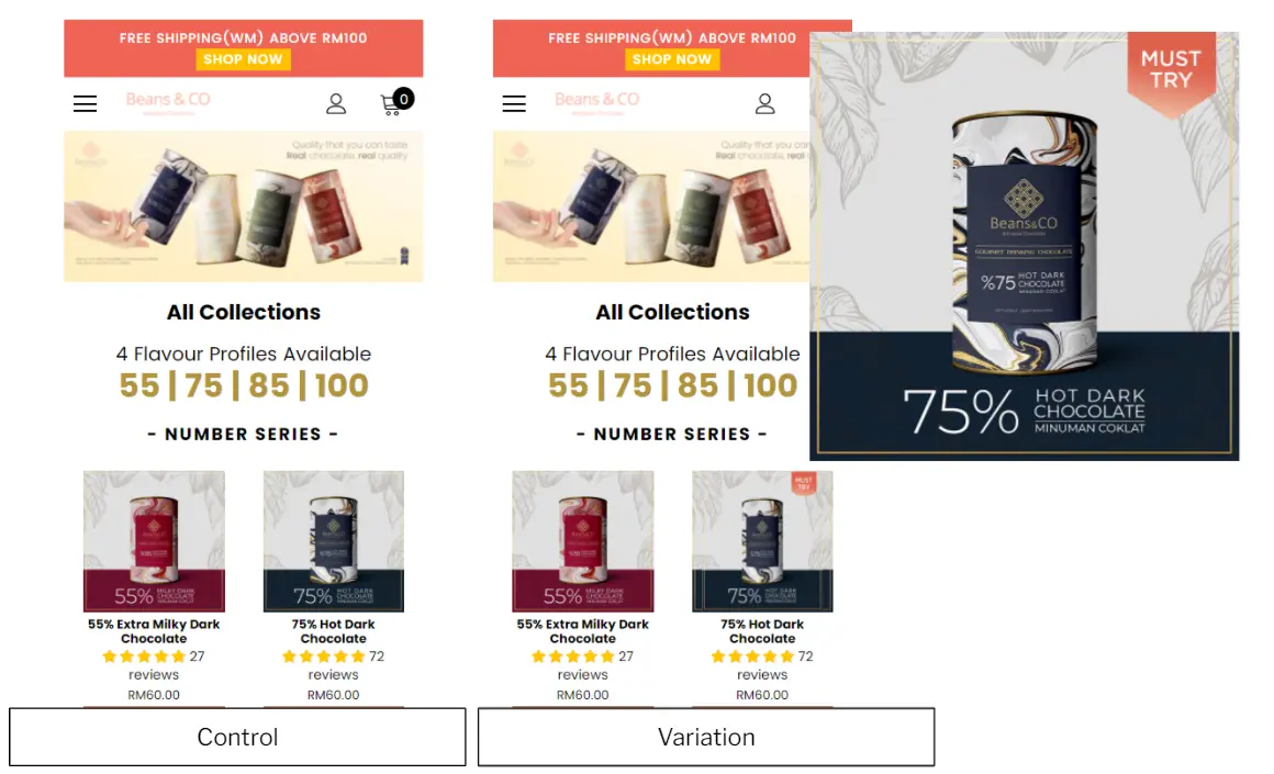 This test was a success as it captured a 9.33% increase in the quantity sold of the highlighted product. It had a positive impact on the overall sales revenue as it prompted users to take the next step in the online shopping process, such as adding items to their cart and making a purchase. Also, the product label is effective in uplifting a 14% in conversion rate. It instils trust and credibility to users towards the products and brands.